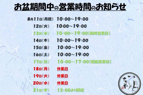 最新情報 2025/09/02 おしらせ 【土曜日の”ちょっと”えちごやおもせ始めます♪】 2025/08/05 おしらせ お盆期間の営業時間について 2025/05/10 おしらせ 臨時休業のお知らせ 【2025年5月15日(木)】 2021/06/06 おしらせ ONLINE SHOP開設しました! 最新情報 一覧