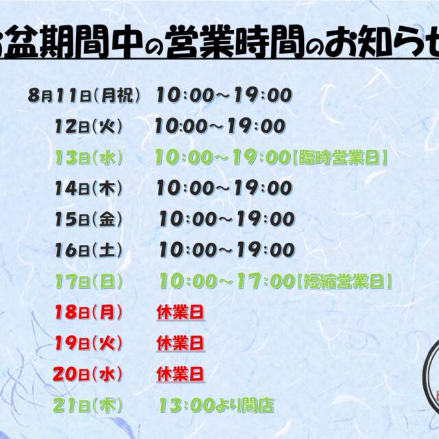 おしらせ 【土曜日の”ちょっと”えちごやおもせ始めます♪】 おしらせ お盆期間の営業時間について おしらせ 臨時休業のお知らせ 【2025年5月15日(木)】 おしらせ ONLINE SHOP開設しました! おしらせ 第2駐車場のご案内 越後屋 > 最新情報